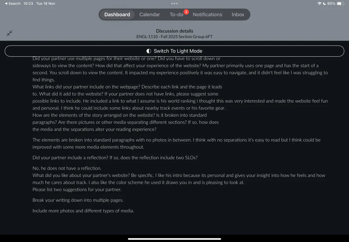 Through out the entire semester we had to get each of our SWA’s and projects peer reviewed by a class mate. This was done by a set of questions which Dr. Wilson had given to us to where we then had to go into the discussion post and reply with who we were going to peer review as well as answering the questions to make sure that person had lol of the needed requirements. I had a few suggestions from my peer review one of them bing that I should separate my home page in my discourse community into separate pages, such an intro, value and terminology page etc.